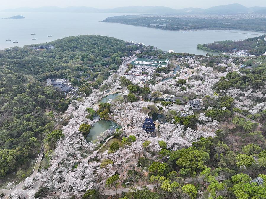無錫市太湖黿頭渚風(fēng)景區(qū)春色(2025年3月27日攝,無人機(jī)照片)。新華社記者 季春鵬 攝