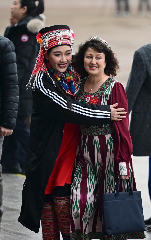 3月4日,中國(guó)人民政治協(xié)商會(huì)議第十四屆全國(guó)委員會(huì)第四次會(huì)議在北京人民大會(huì)堂開幕。這是楊鈺尼委員(左)與木合拜爾·阿布都爾委員一起步入會(huì)場(chǎng)。