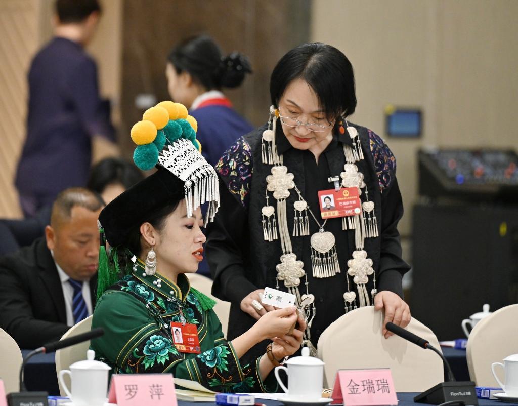 3月7日,金瑞瑞代表(前左)在十四屆全國(guó)人大四次會(huì)議云南代表團(tuán)開放團(tuán)組會(huì)議前與另一位代表交流。