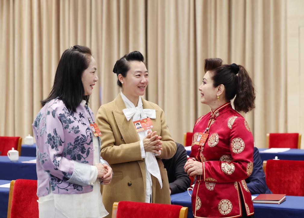 3月6日,全國(guó)政協(xié)委員迪麗娜爾·阿布拉(右)、周利(中)和苗潔在文化藝術(shù)、體育界委員聯(lián)組會(huì)前交流。