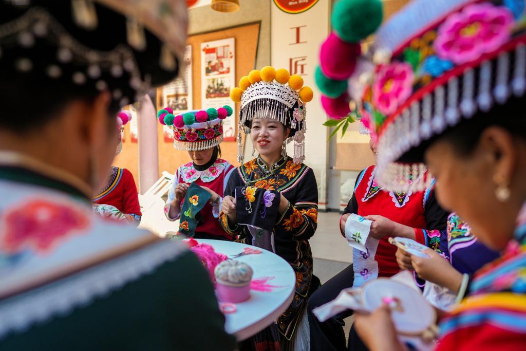 2月9日,在云南楚雄彝族自治州牟定縣,全國人大代表金瑞瑞在自己的工作室內和繡娘們刺繡、談心。