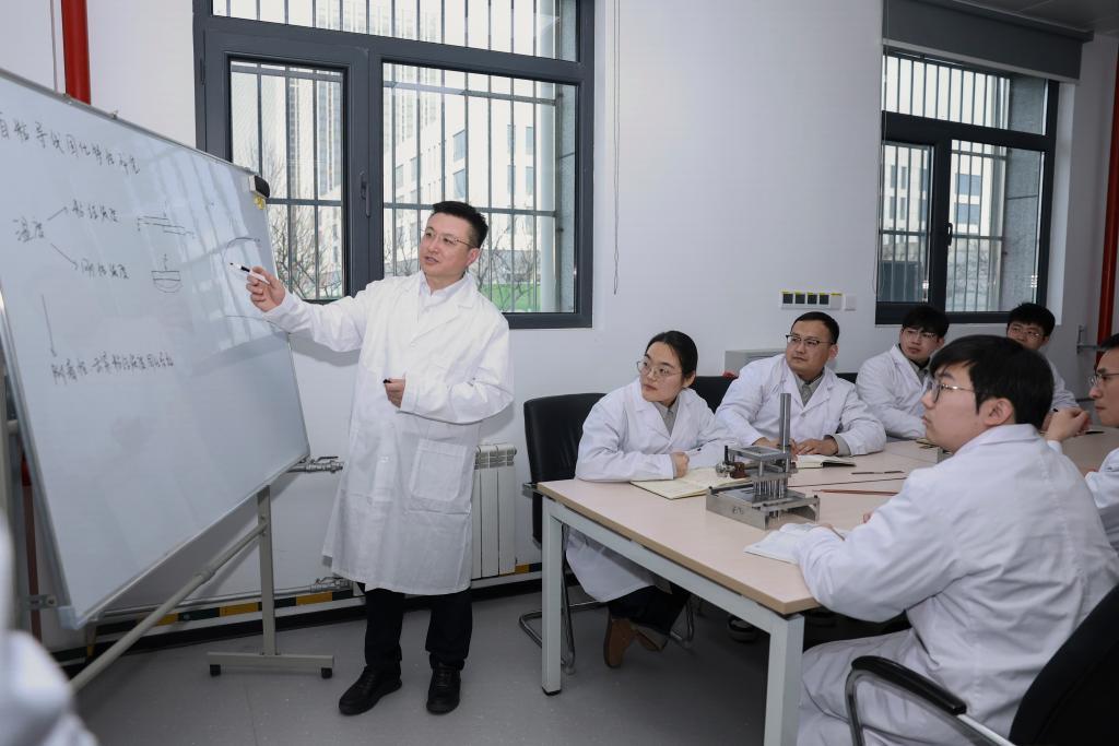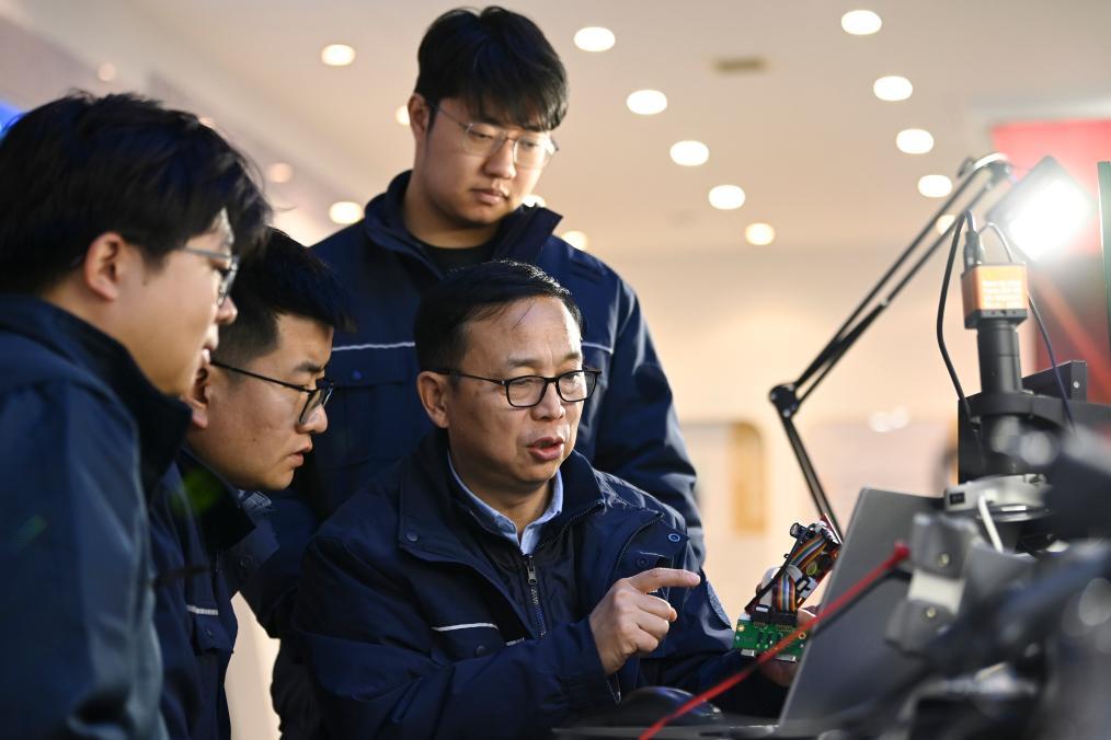 2月13日,在位于山東濟南的山東電工電氣設備公司工藝實驗室,全國人大代表、中國電氣裝備集團副總經(jīng)理張帆(左一)主持自粘導線固化特性實驗方案討論。