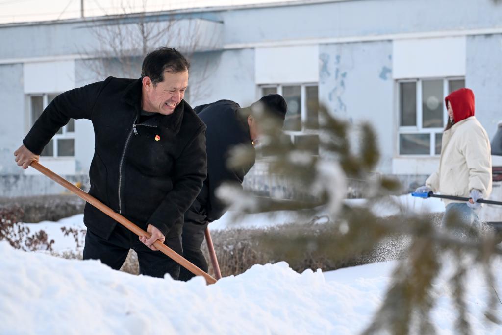 2月9日,在新疆伊犁哈薩克自治州新源縣,全國人大代表木沙江·海拉特(前)在克熱格塔斯村黨群服務中心和當?shù)馗刹恳黄鹎謇矸e雪。