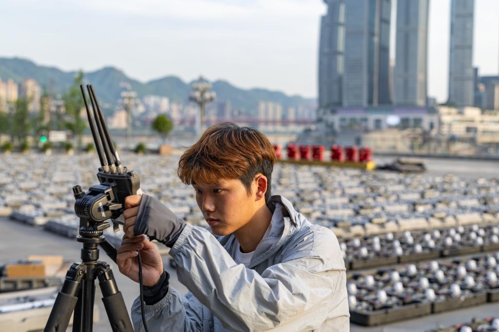 2025年5月1日,陸子祥在重慶市南岸區(qū)調(diào)試無線網(wǎng)橋設(shè)備,為無人機(jī)燈光秀做準(zhǔn)備。陸子祥和同事負(fù)責(zé)規(guī)劃無人機(jī)燈光秀的飛行路徑并執(zhí)行表演方案,用科技為城市夜景增添璀璨光彩。