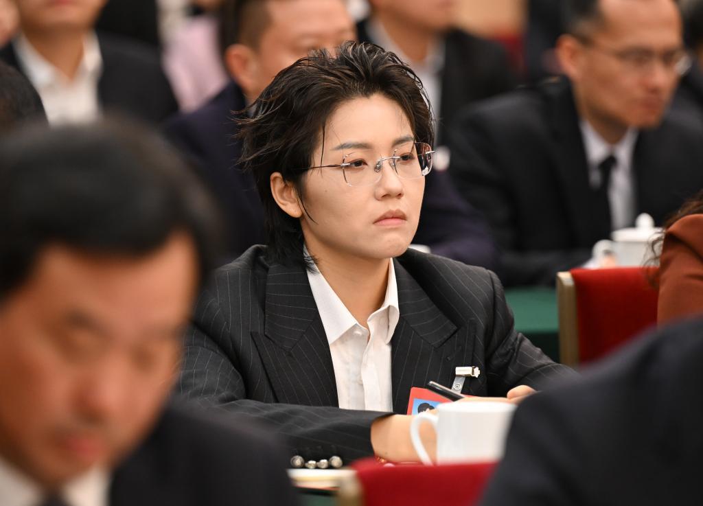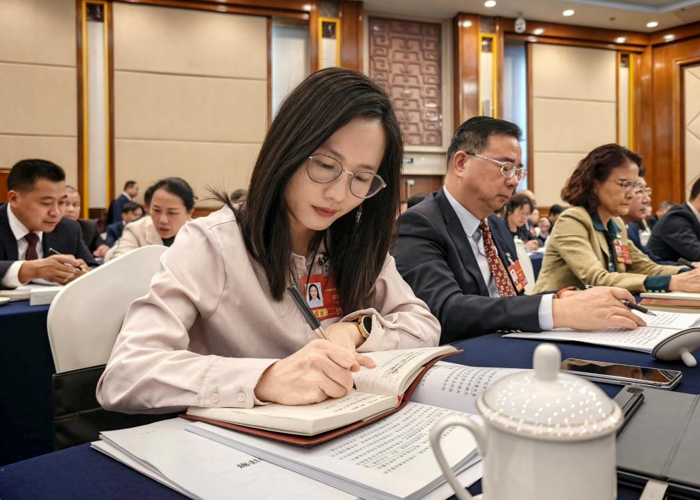 2026年3月7日,十四屆全國人大四次會議江蘇代表團(tuán)舉行開放團(tuán)組會議。這是李楠楠代表在聽會。