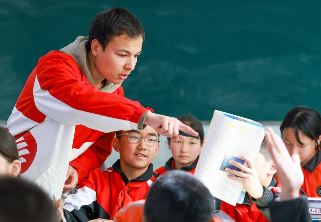 2025年4月23日,在新疆克孜勒蘇柯爾克孜自治州阿圖什市哈拉峻鄉(xiāng)謝依特小學(xué),支教教師麥麥提伊敏·庫迪熱提給學(xué)生上課。他所服務(wù)的戍邊支教西部計(jì)劃志愿者服務(wù)隊(duì),在這所邊境小學(xué)辛勤耕耘,用教育為祖國邊疆播種希望,并因此榮獲中國青年五四獎(jiǎng)?wù)隆?/p>