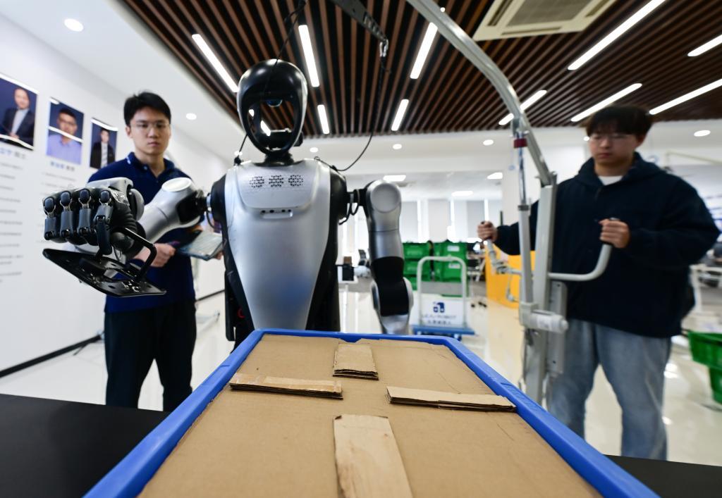 2025年10月24日,張鴻偉(左)在合肥樂聚機(jī)器人技術(shù)有限公司實(shí)驗(yàn)區(qū)域內(nèi)觀察機(jī)器人抓取零件測試運(yùn)行情況。張鴻偉是一名機(jī)器人應(yīng)用開發(fā)工程師,他通過編寫代碼、調(diào)試模擬,“教”人形機(jī)器人進(jìn)行工業(yè)生產(chǎn)任務(wù)。