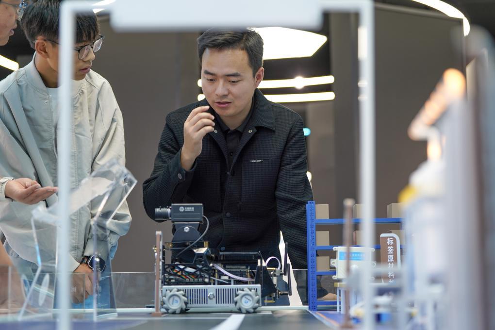 2025年10月29日,鄭棋元(右)在云南技師學(xué)院利用沙盤模型與學(xué)生探討研發(fā)項(xiàng)目。作為2025年認(rèn)定的“大國工匠人才”,鄭棋元曾在第45屆世界技能大賽上奪得移動(dòng)機(jī)器人項(xiàng)目金牌,實(shí)現(xiàn)中國隊(duì)在該項(xiàng)目金牌“零的突破”。賽后,他選擇回到母校任教,致力于培養(yǎng)技能人才。