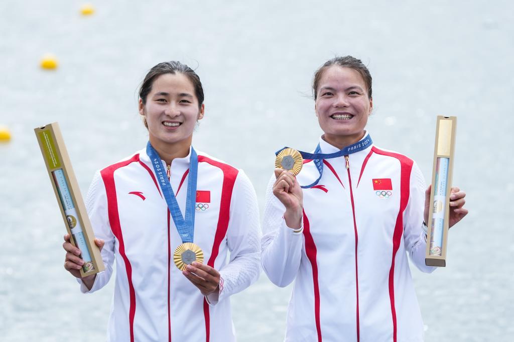2024年8月9日,中國組合徐詩曉(右)/孫夢雅在巴黎奧運(yùn)會皮劃艇靜水女子雙人劃艇500米決賽中奪得冠軍后,在頒獎(jiǎng)儀式上展示金牌。