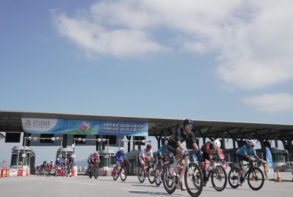 2025年11月8日,第十五屆全國(guó)運(yùn)動(dòng)會(huì)公路自行車(chē)男子個(gè)人賽選手經(jīng)過(guò)港珠澳大橋香港口岸車(chē)輛通關(guān)廣場(chǎng)。新華社發(fā)(呂小煒 攝)