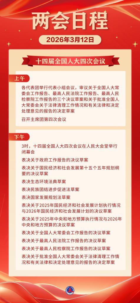 12日下午3時(shí),十四屆全國(guó)人大四次會(huì)議在人民大會(huì)堂舉行閉幕會(huì),表決關(guān)于政府工作報(bào)告的決議草案,表決關(guān)于國(guó)民經(jīng)濟(jì)和社會(huì)發(fā)展第十五個(gè)五年規(guī)劃綱要的決議草案,表決生態(tài)環(huán)境法典草案,表決民族團(tuán)結(jié)進(jìn)步促進(jìn)法草案,表決國(guó)家發(fā)展規(guī)劃法草案,表決關(guān)于2025年國(guó)民經(jīng)濟(jì)和社會(huì)發(fā)展計(jì)劃執(zhí)行情況與2026年國(guó)民經(jīng)濟(jì)和社會(huì)發(fā)展計(jì)劃的決議草案,表決關(guān)于2025年中央和地方預(yù)算執(zhí)行情況與2026年中央和地方預(yù)算的決議草案,表決關(guān)于全國(guó)人大常委會(huì)工作報(bào)告的決議草案,表決關(guān)于最高人民法院工作報(bào)告的決議草案,表決關(guān)于最高人民檢察院工作報(bào)告的決議草案,表決關(guān)于批準(zhǔn)全國(guó)人大常委會(huì)關(guān)于法律清理工作情況和有關(guān)法律和決定處理意見(jiàn)的報(bào)告的決定草案。