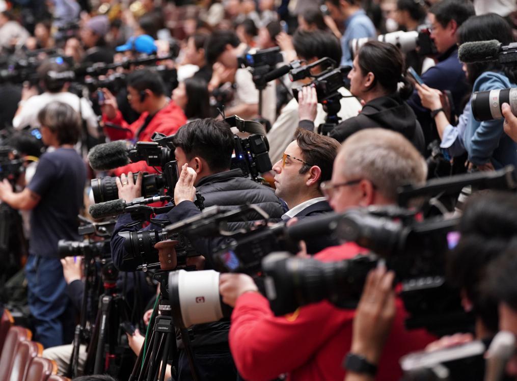 3月12日,第十四屆全國人民代表大會第四次會議在北京人民大會堂舉行閉幕會。這是記者在閉幕會上采訪。